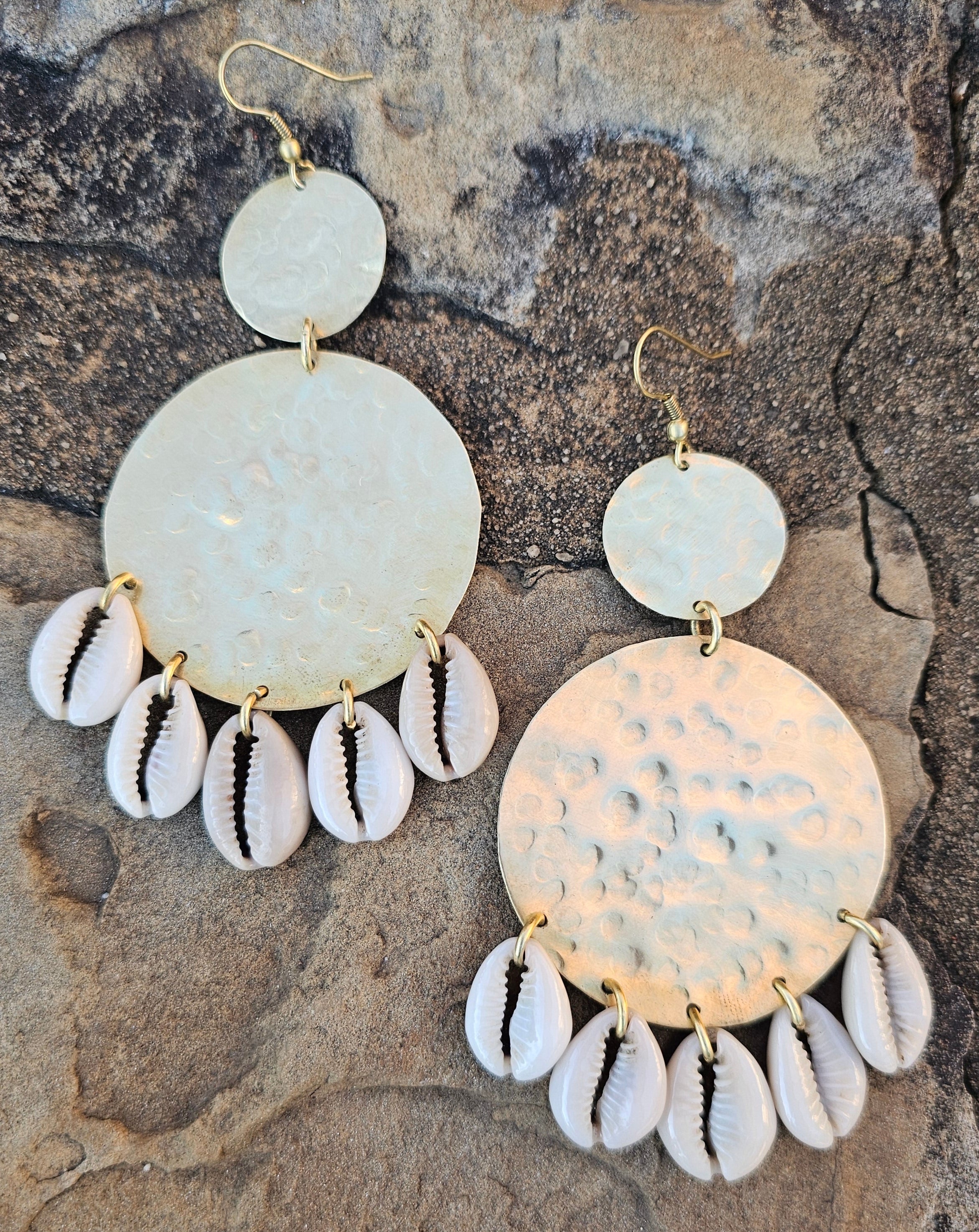 Hammered Double Circle Cowrie Shell Brass Earrings